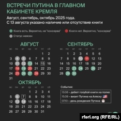 Статус еще двух возможных "консерв" пока не подтвержден: это станет ясно, если на будущих публикациях Кремля снова будет видна книга на полке. На этих встречах фигурировали: